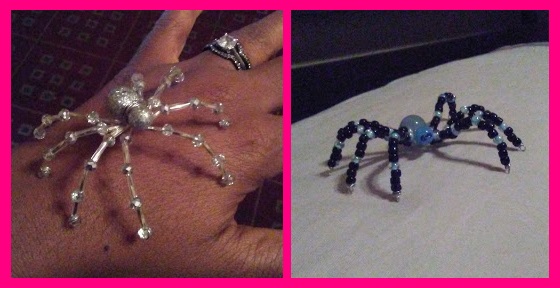 Beaded spider w/ handmade body (Approximately 1 inch x 1/2 inch) and glass beaded legs (either crystal or colored glass beads or both) legs will be approximately 1 1/2 - 2 inches each. Alloverachnids can be made with to be worn as a pendant upon request and there is no additional charge.