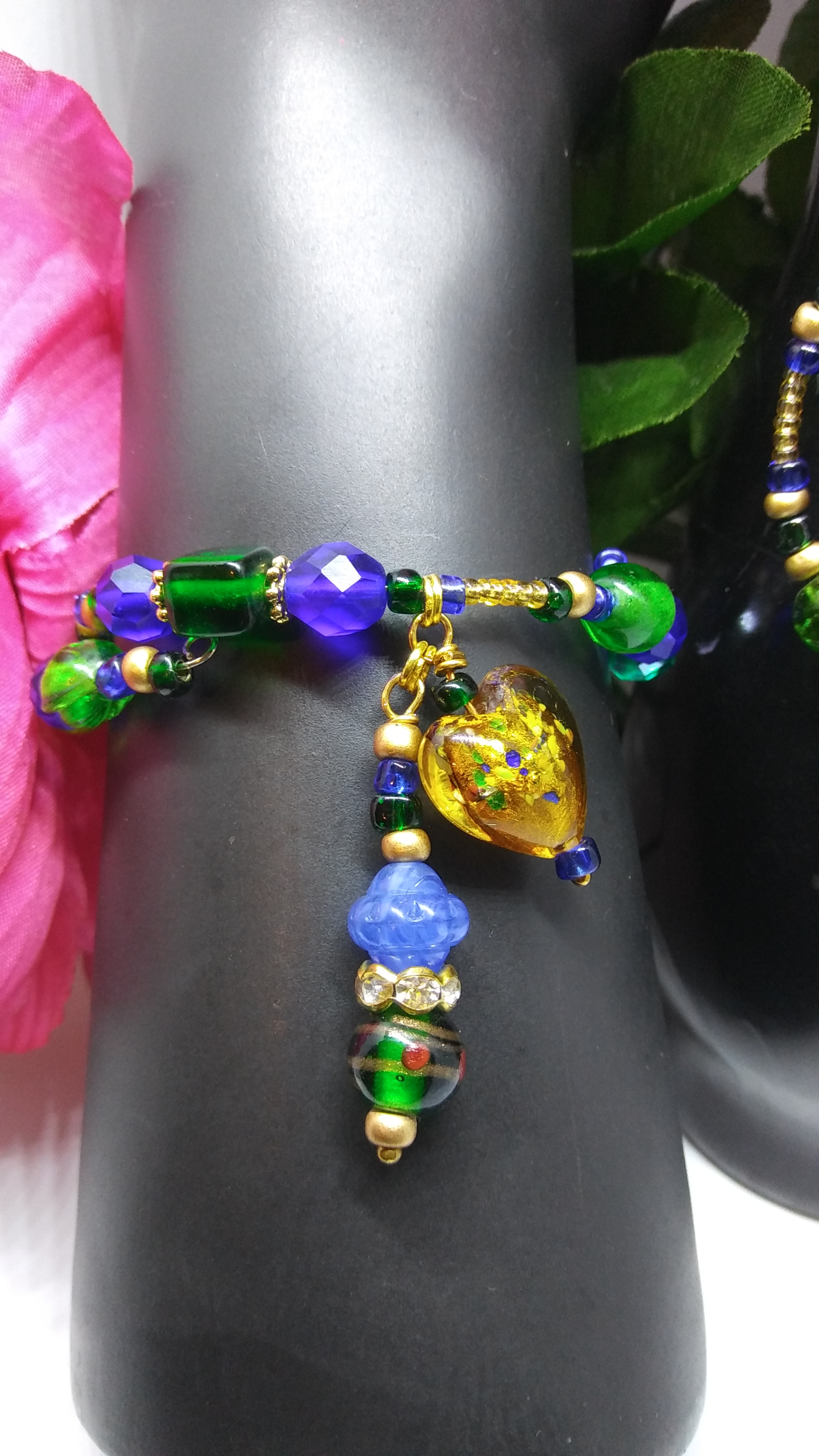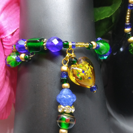Your newest gal pal has arrived and is stunning in her gold, sapphire and emerald colors.  She doesn't want ro be too clingy but she will hug closely and comfortably by wrapping at least once around ANY wrist and happily bounces a dangle composed of beautiful hand-formed lampwork beads with golden accents.