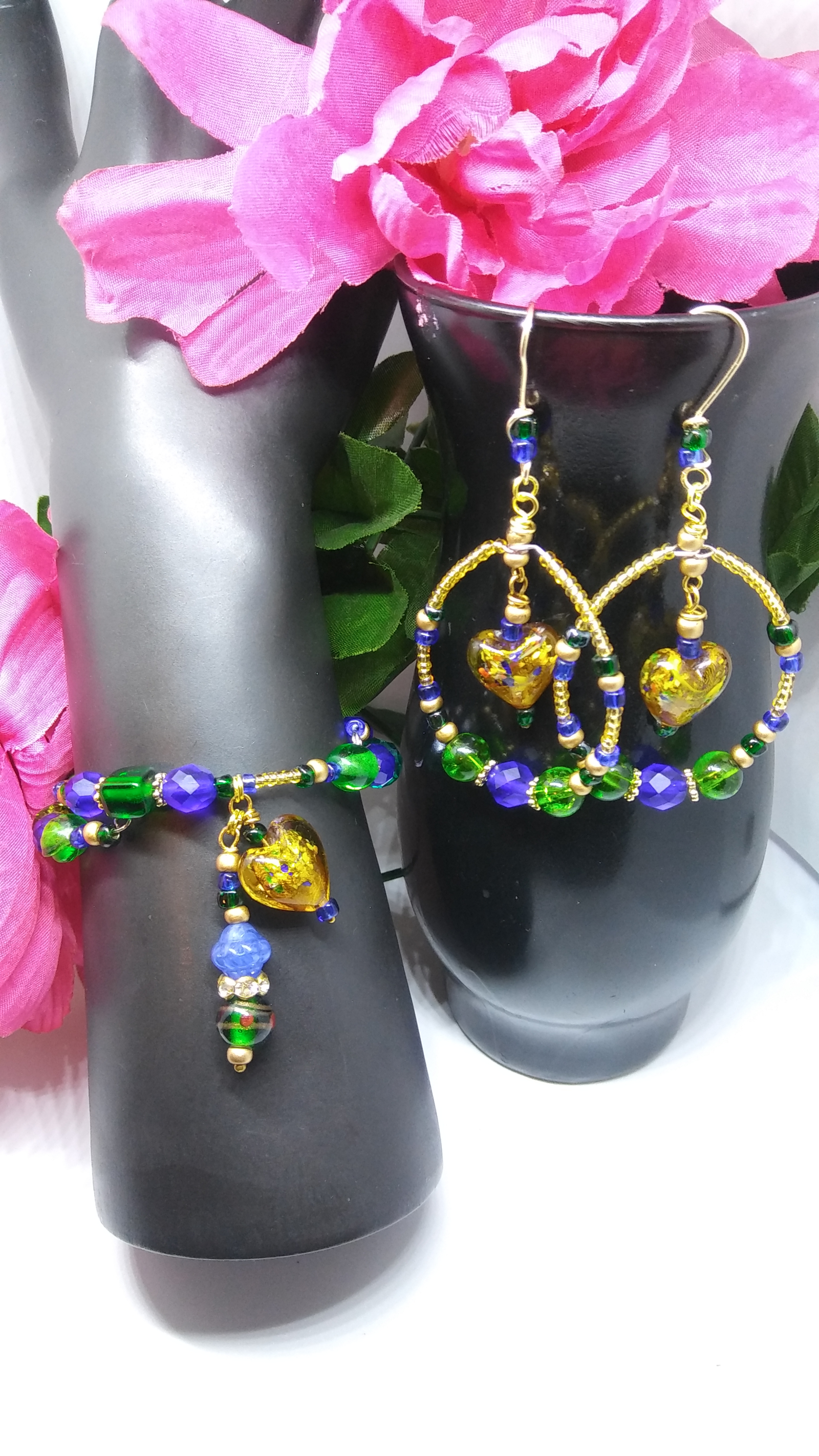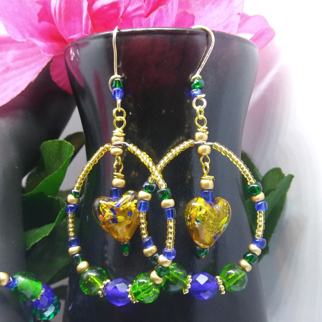 She shows off her golden lampwork hearts and its display of  of emerald and sapphire colors inside.