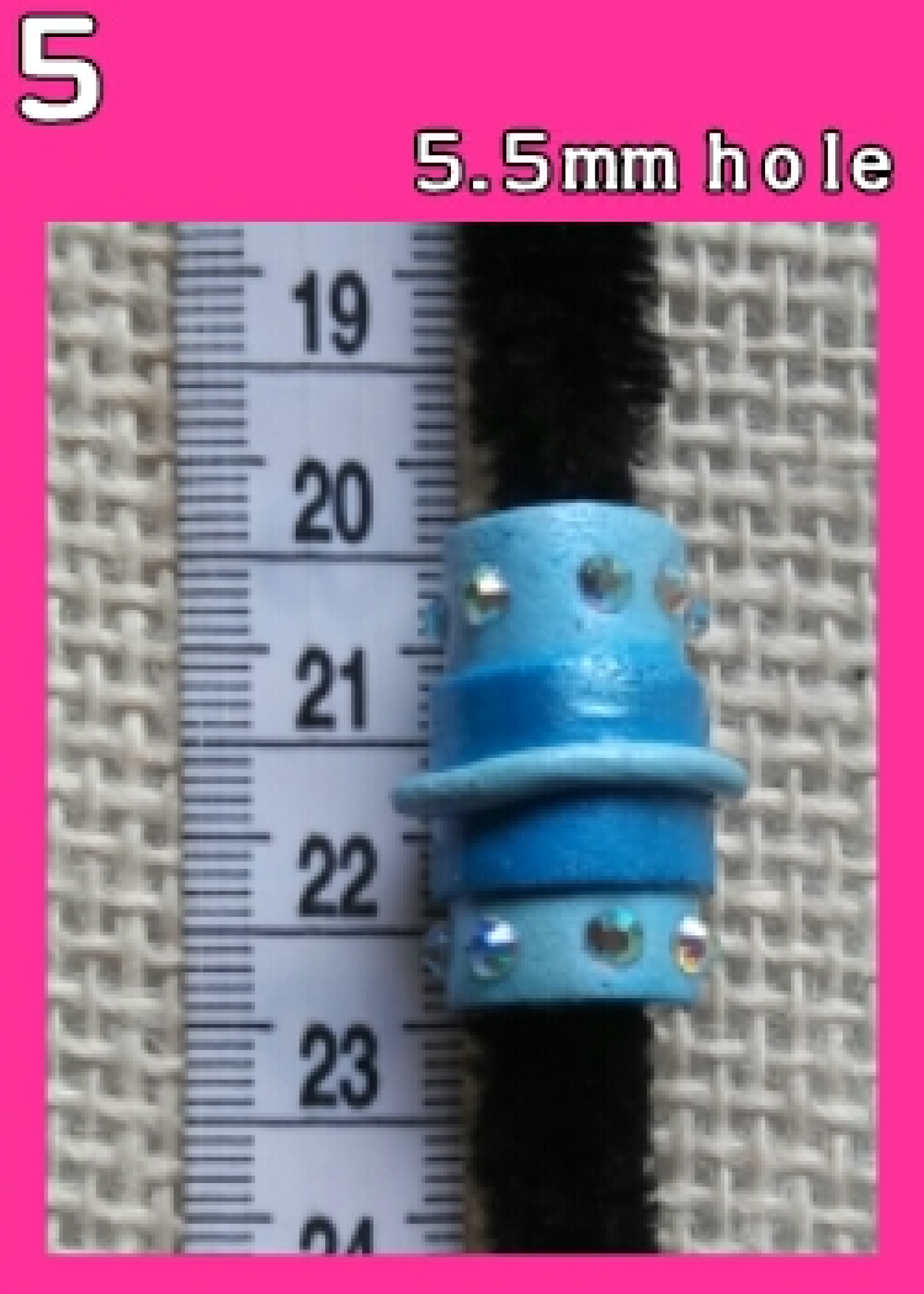 Individual Loc Jewel made as a sky blue tube with darker blue center band. Encircled by small crystals at the top and bottom of the tube. Approximately 1 inch in length.