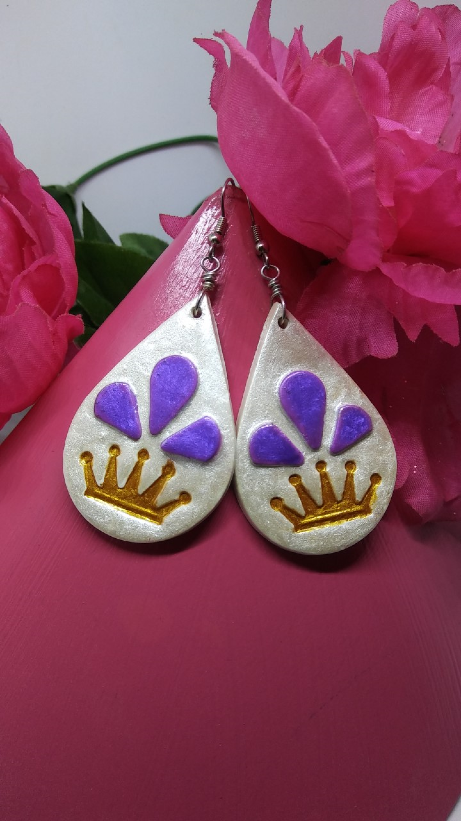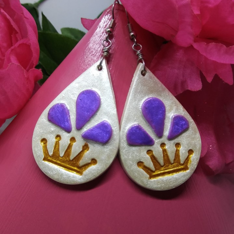 Tear-drop earrings with a pearly white background.  Triple tear drops above a golden crown represent the tears black women have shed over for generations - remaining Queens century after century.
