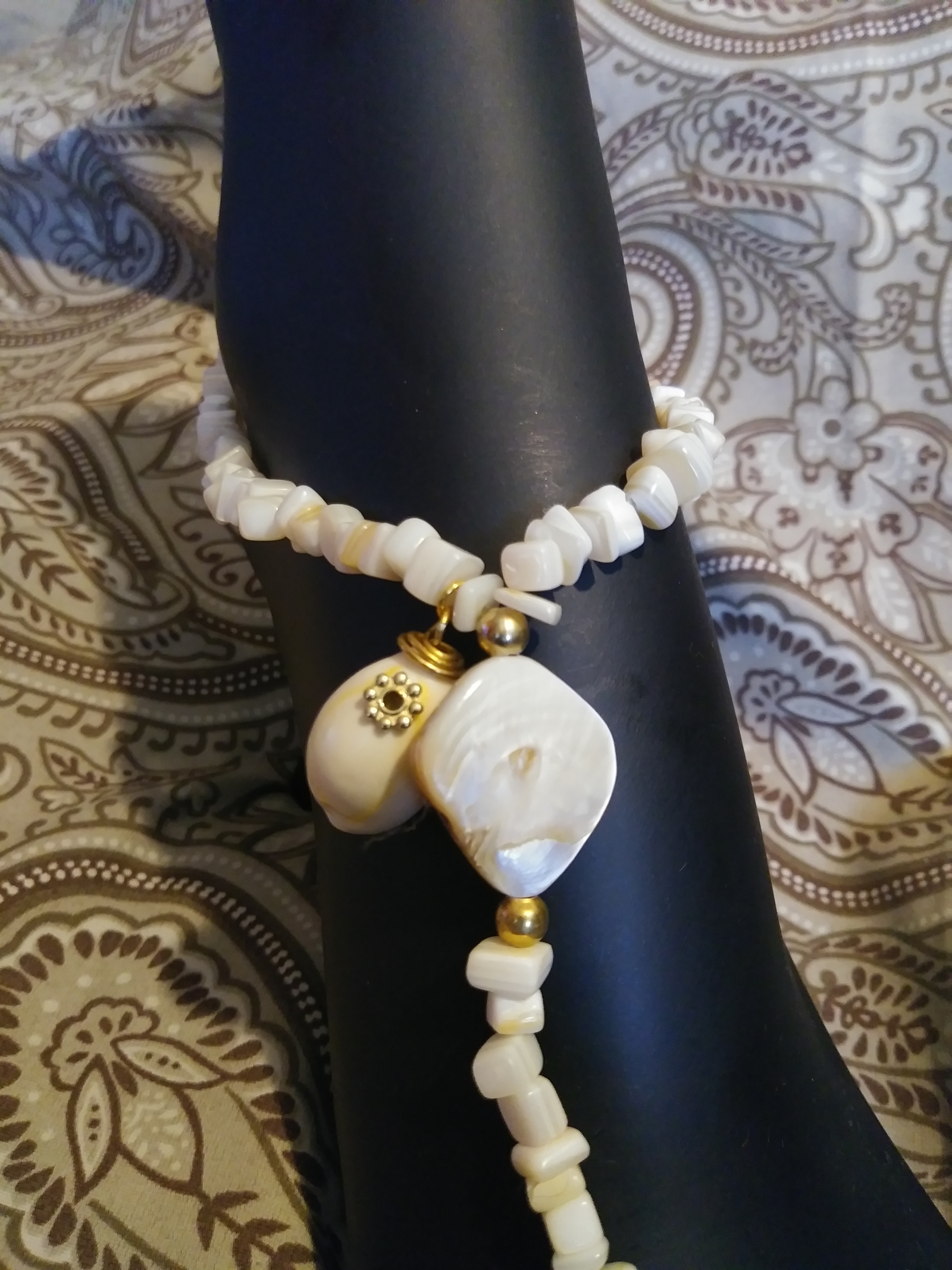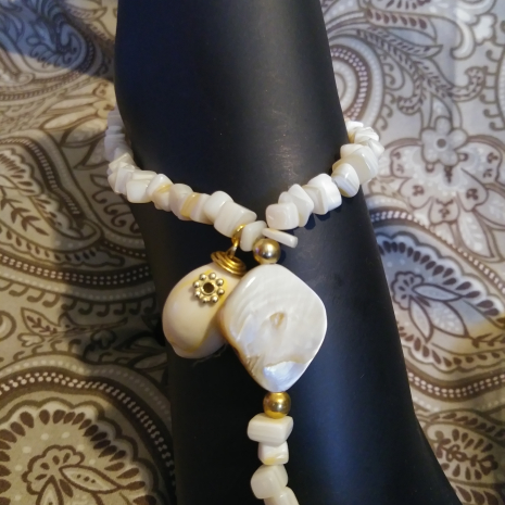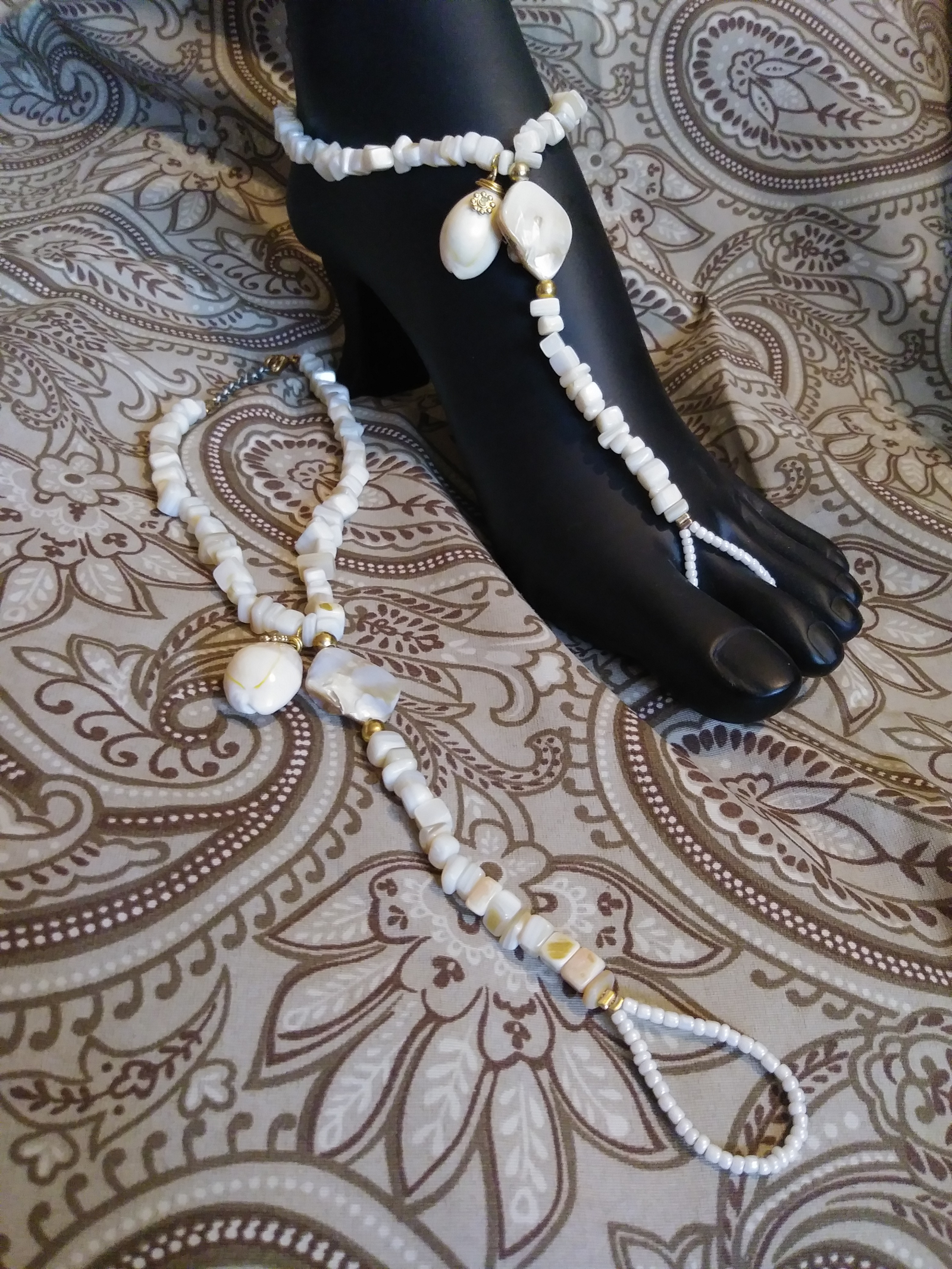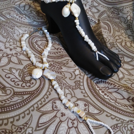 A pair of barefoot sandals made with mother id pearl chips and a complwte cowrie shell accent.