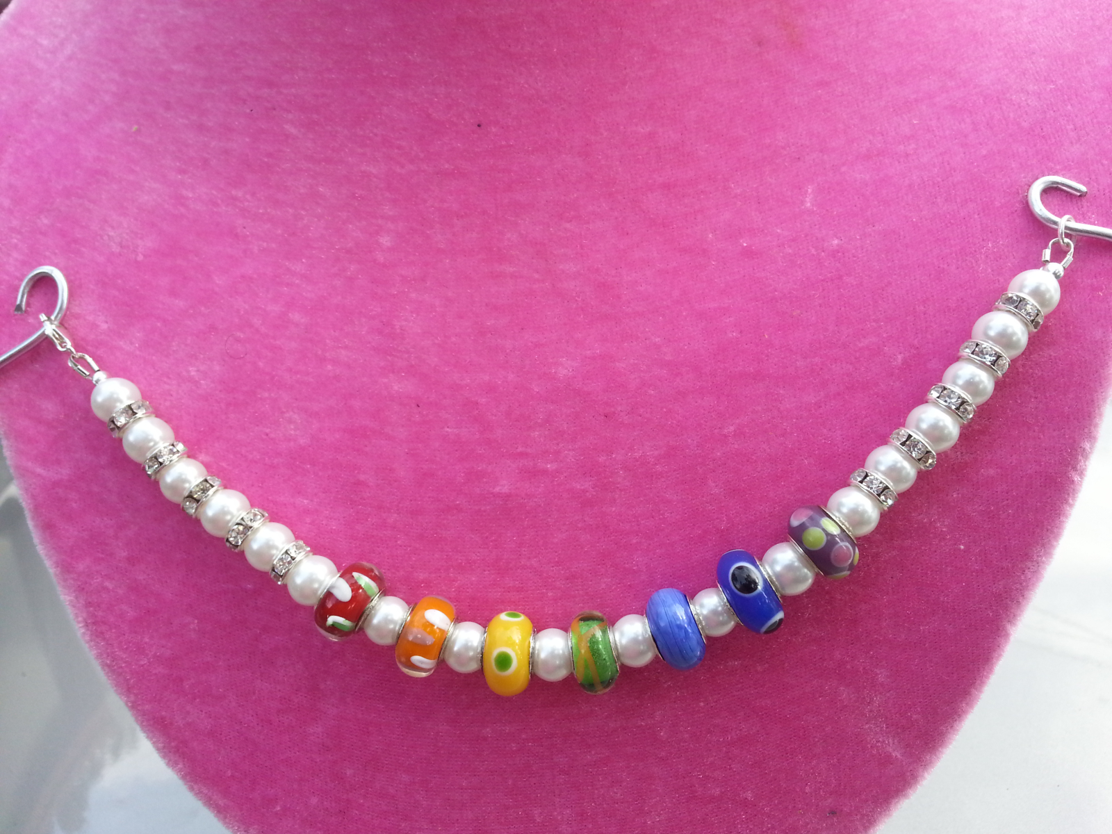 8mm pearls and crystal dividers flank a centered focal rainbow made with European beads. Each one in a beautifully patterned representation of the seven rainbow colors.
