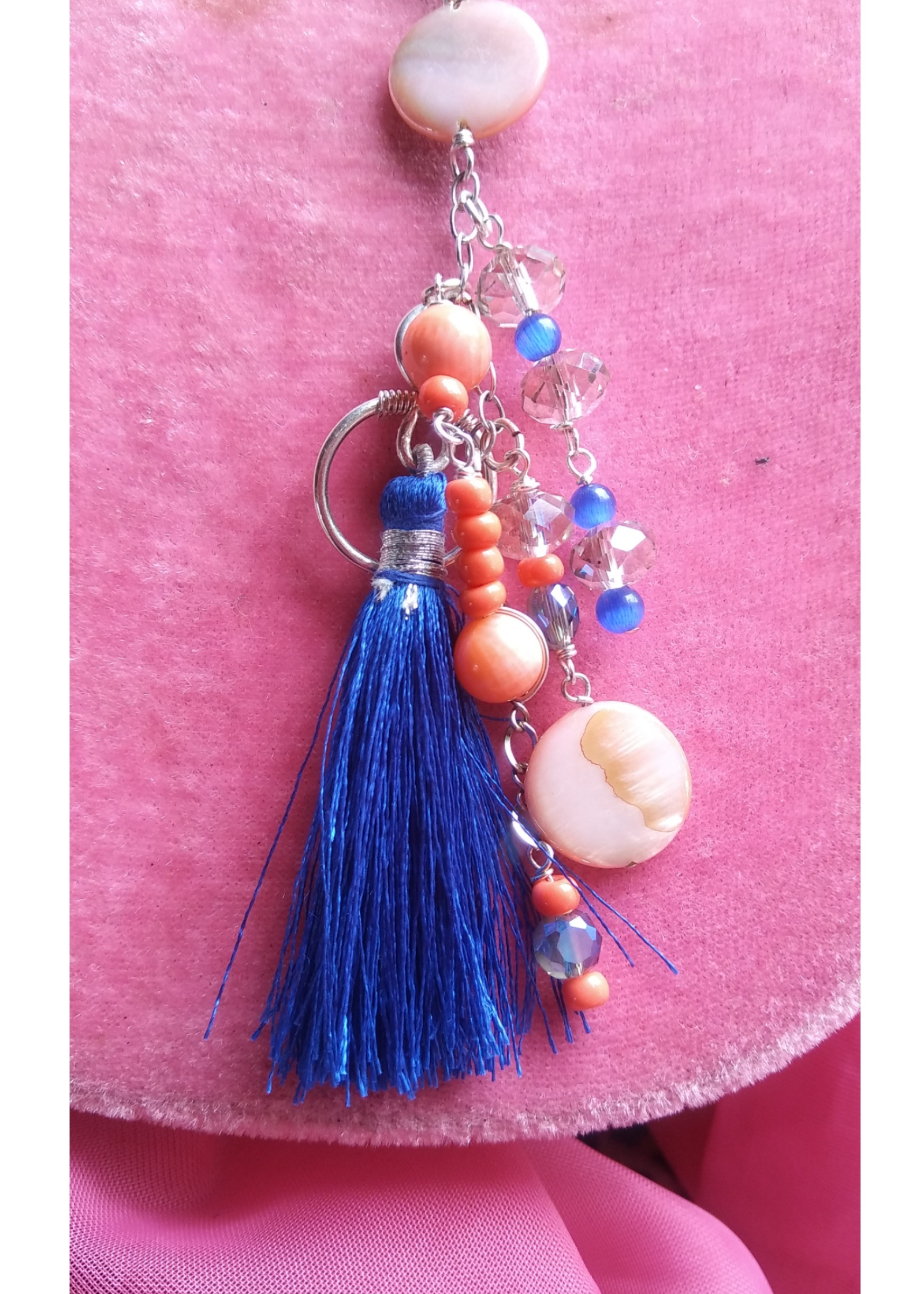 Based with 12mm salmon colored Mother of Pearl discs and sterling silver chain, this Y necklace, Ms.Sass, falls to a dazzling bundle of glass, crystal and gemstone beads mixed in with sterling chain and a royal blue tassel. She is definitely going to add style to your ensemble when paired with her companion earrings. The earrings are very dangly, about 3.5 inches and end in tassels.