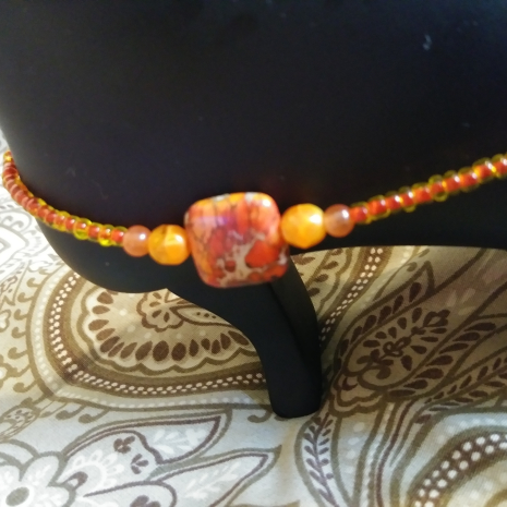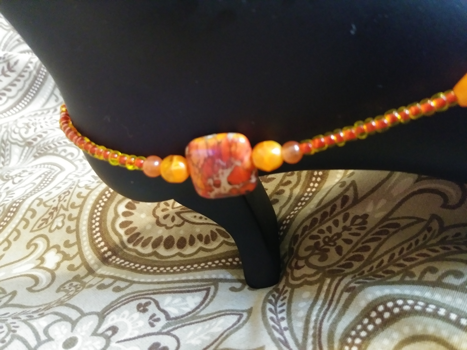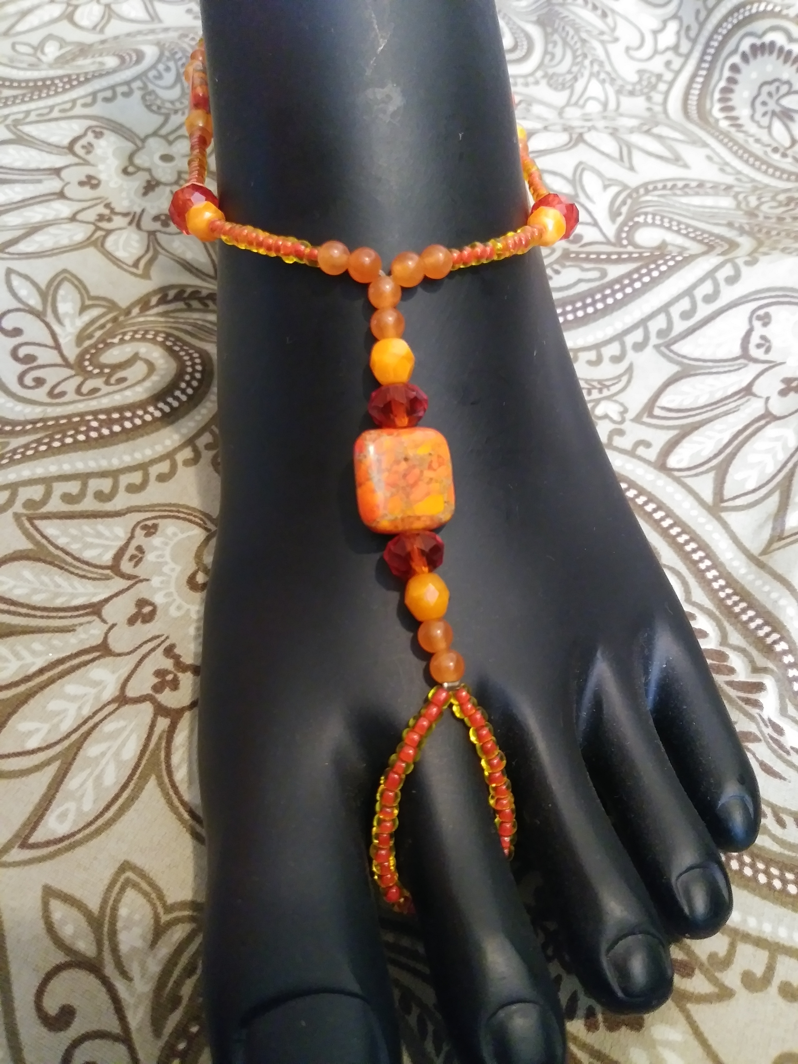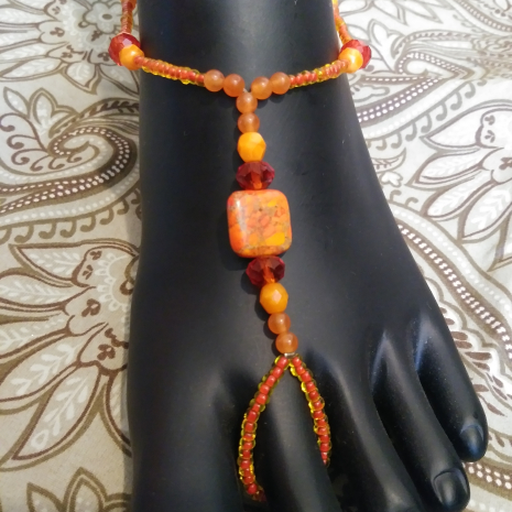 A single barefoot sandal designed and created with a combination of glass and beads. Accented with several orange sea sediment Jade puffed beads.