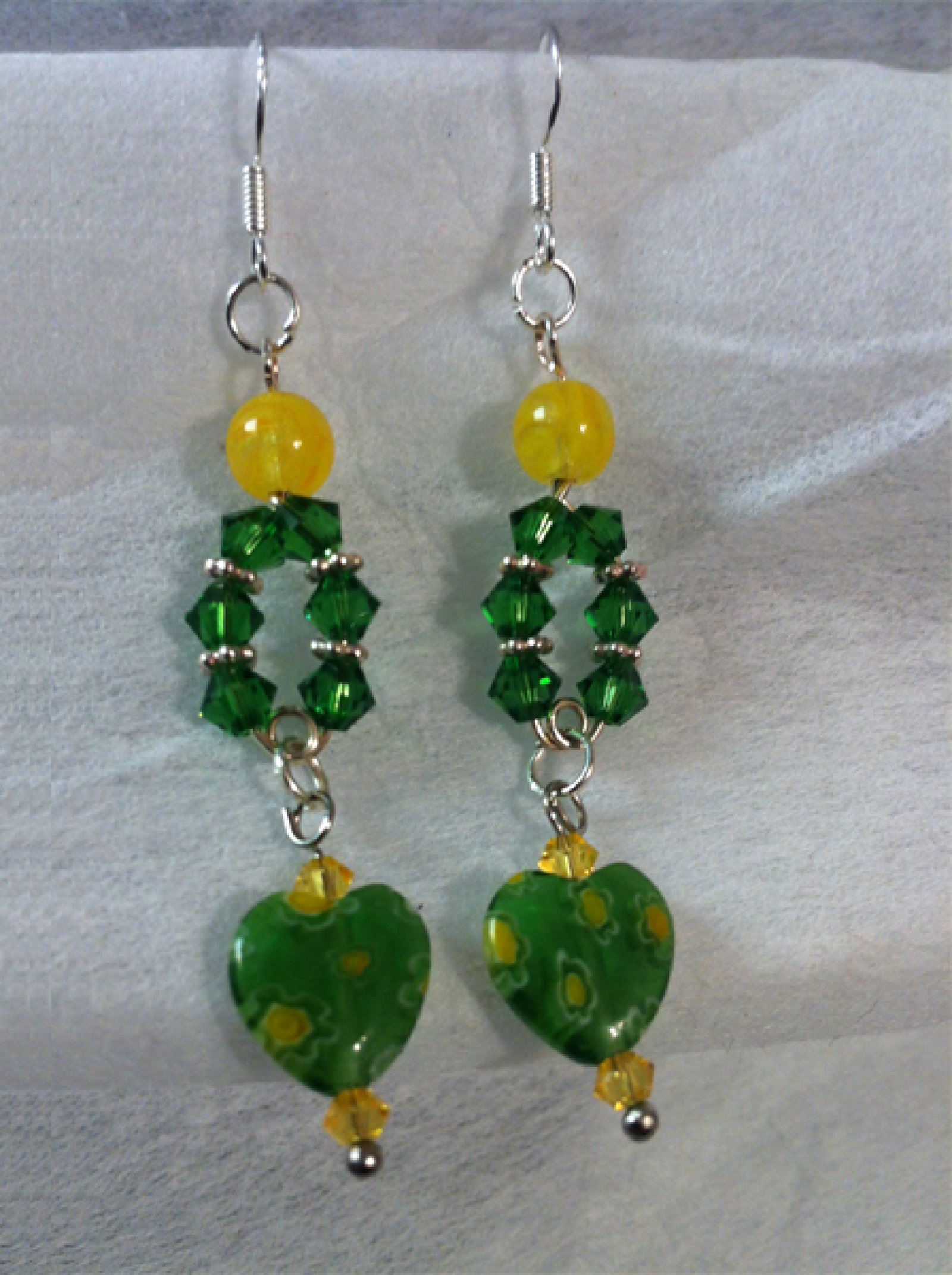 Murano glass heart in green and yellow paired with Swarovski beads in green and yellow make a gorgeous earring topped with a sunny yellow glass bead.